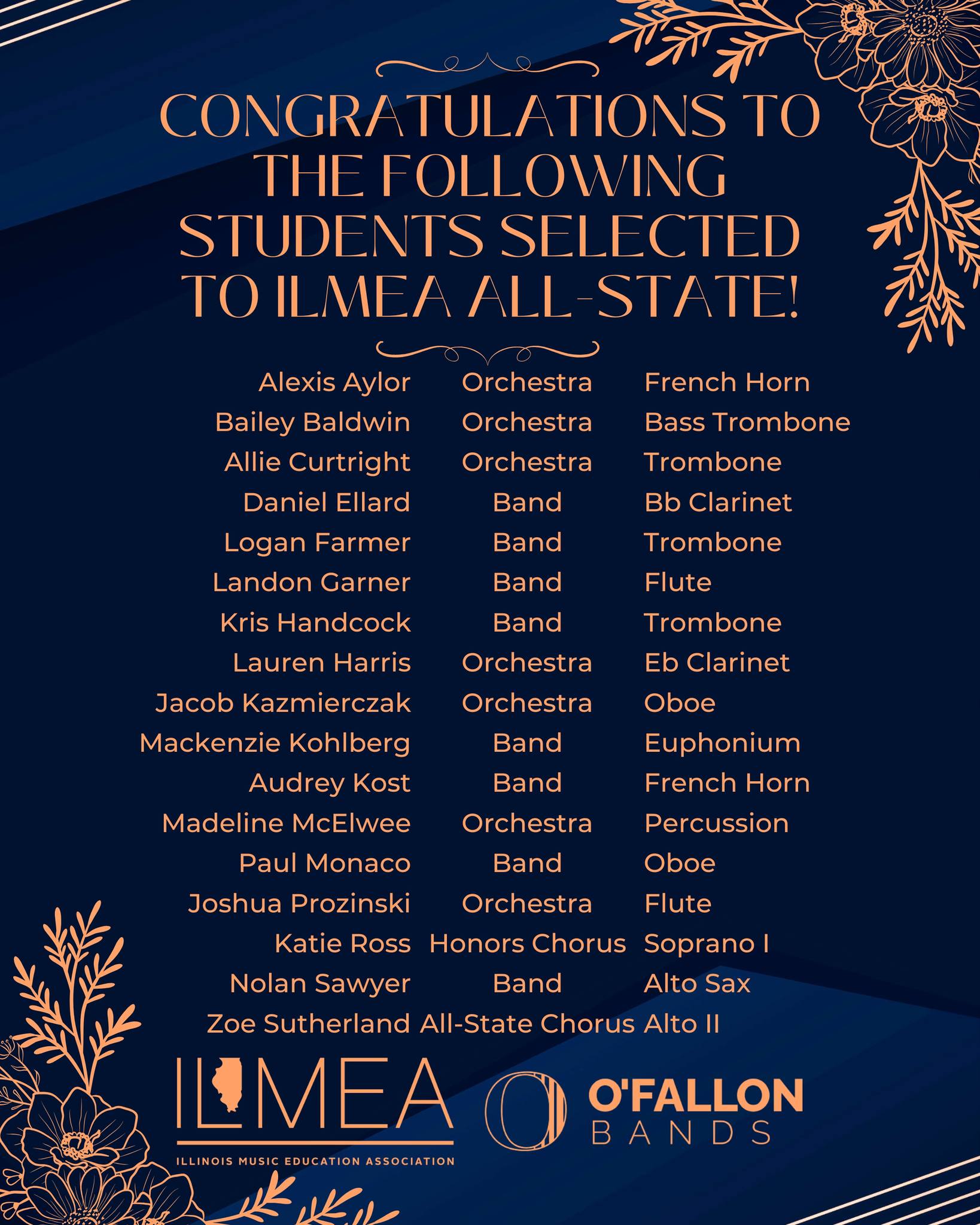 Congratulations to our outstanding students selected for the ILMEA District 6 Concert Festival!